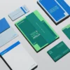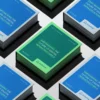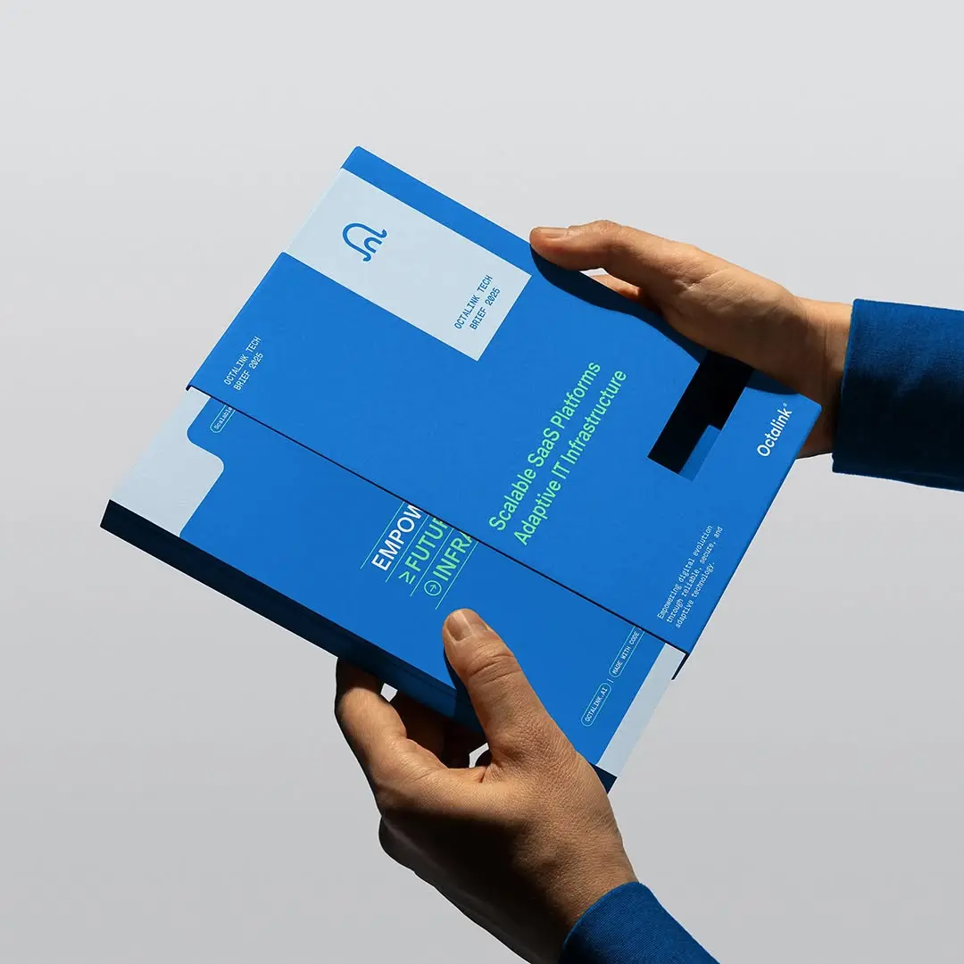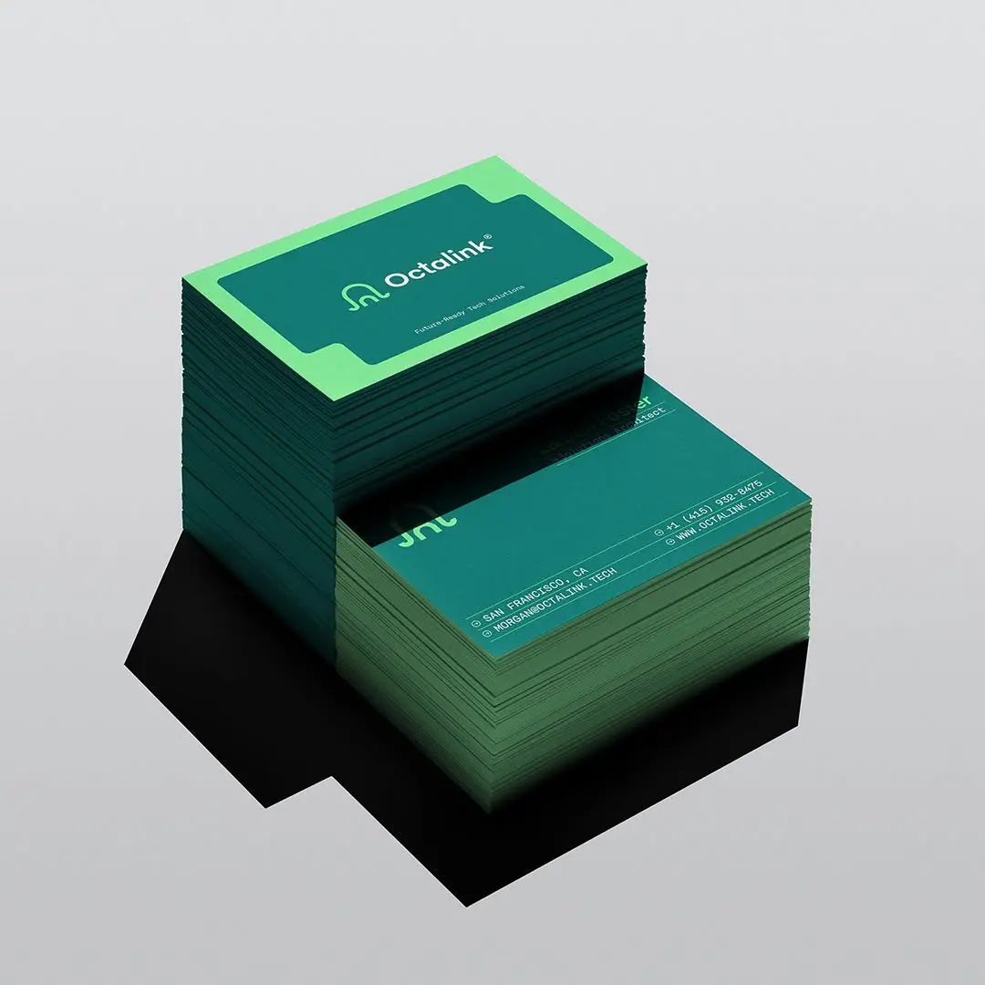 The Octalink identity presents crisp blues and greens with clean sans-serif typography that create a modern, structured, tech-driven impression. Mockups showcase stationery, packaging, business cards, and printed sets arranged with sharp lighting and balanced compositions.