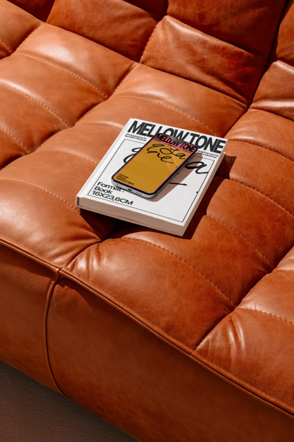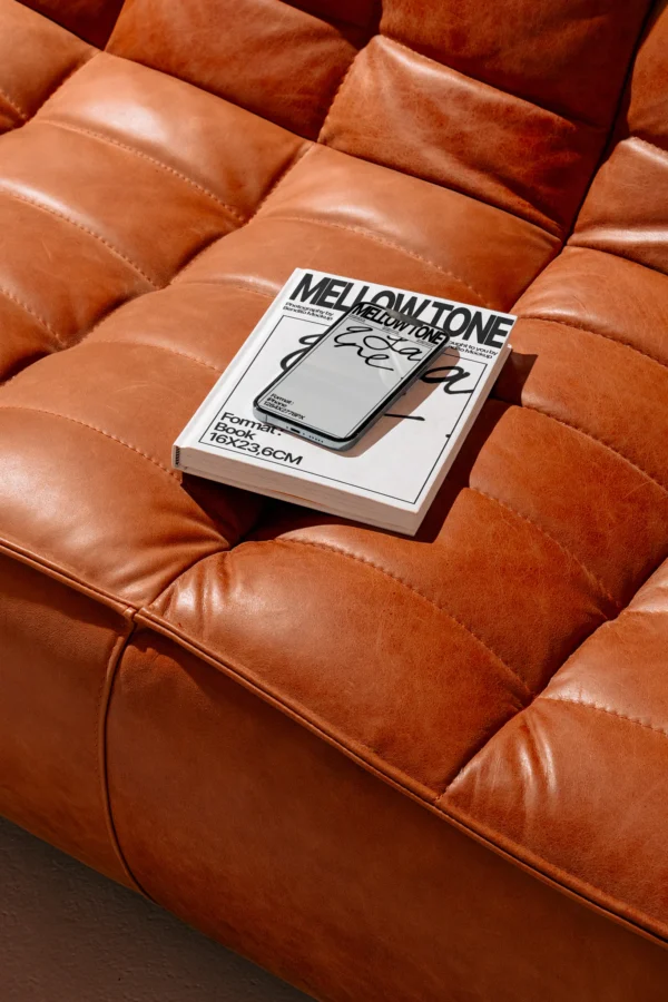 Free iPhone mockup PSD featuring a realistic smartphone placed on a textured leather surface, ideal for showcasing mobile apps, UI designs, and website screens. Perfect for branding presentations, portfolios, and modern digital product previews.