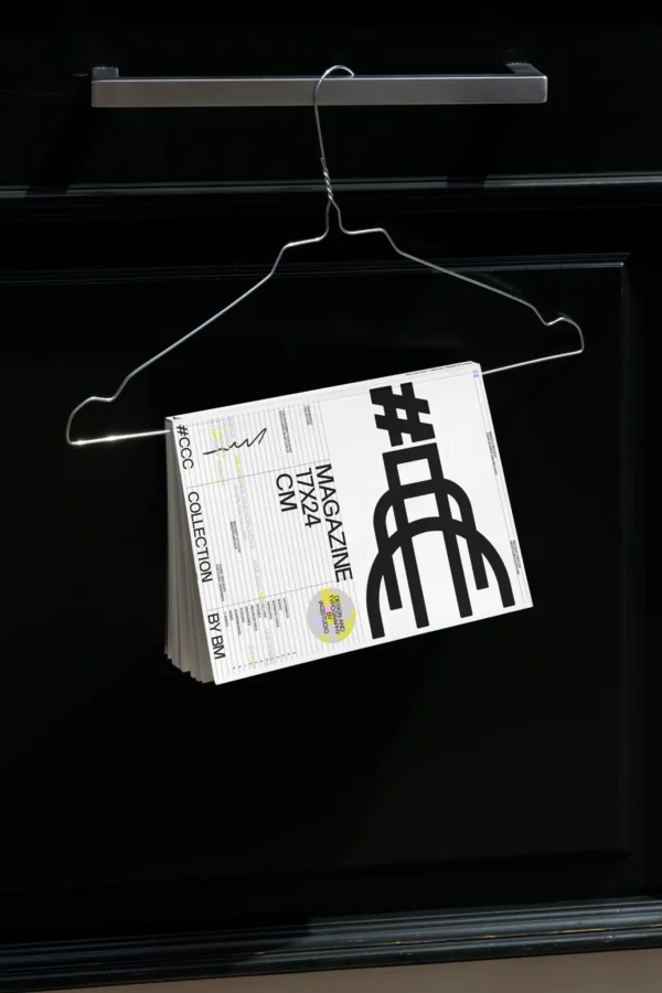 Free magazine mockup featuring a realistic hanging magazine presentation with clean lighting and modern styling, ideal for showcasing editorial layouts, cover designs, and print branding projects. Perfect for portfolios, publishing previews, and professional design presentations.