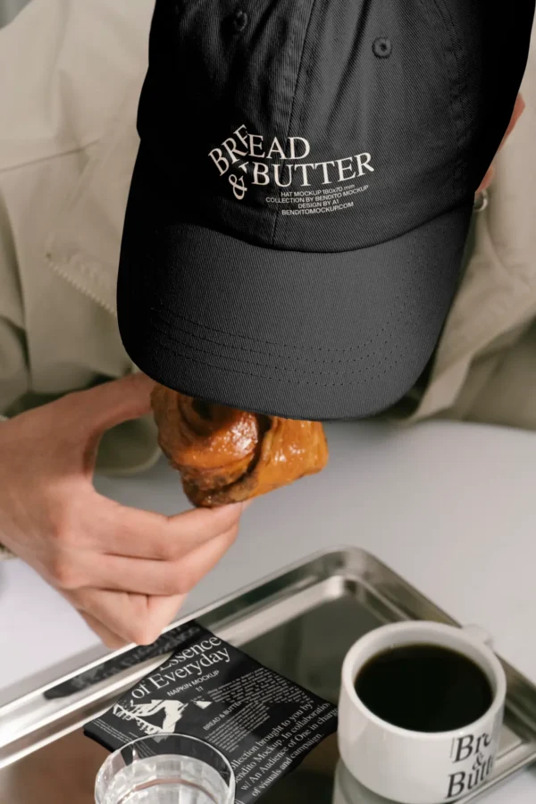 This mockup features a hat integrated into a food and café-inspired setting, creating a warm and approachable branding environment. Ideal for bakery brands, café merchandise, hospitality branding, and lifestyle-driven brand systems.