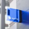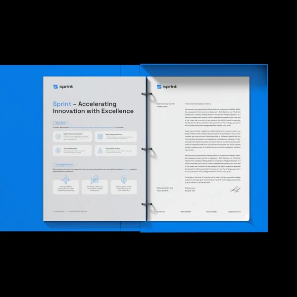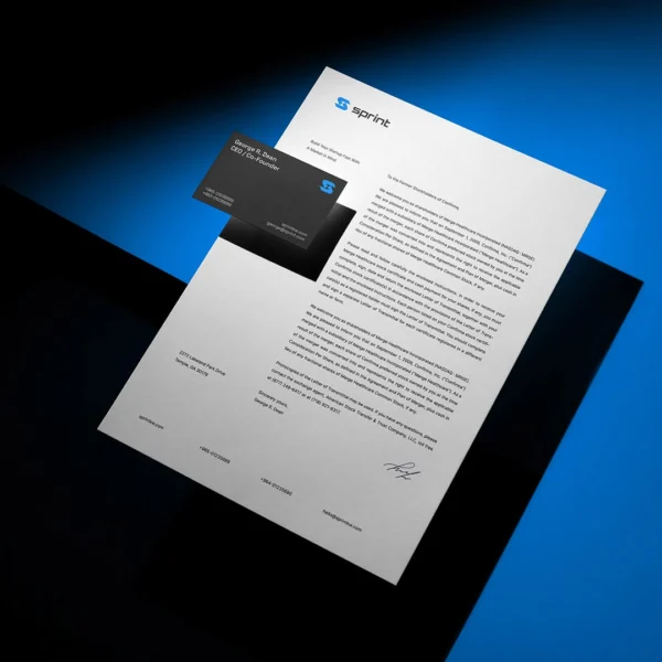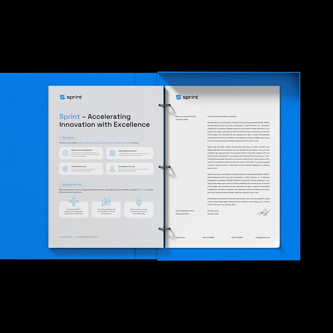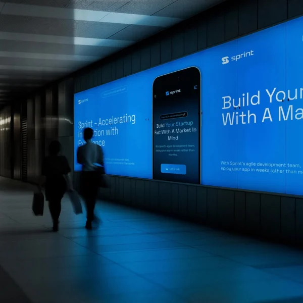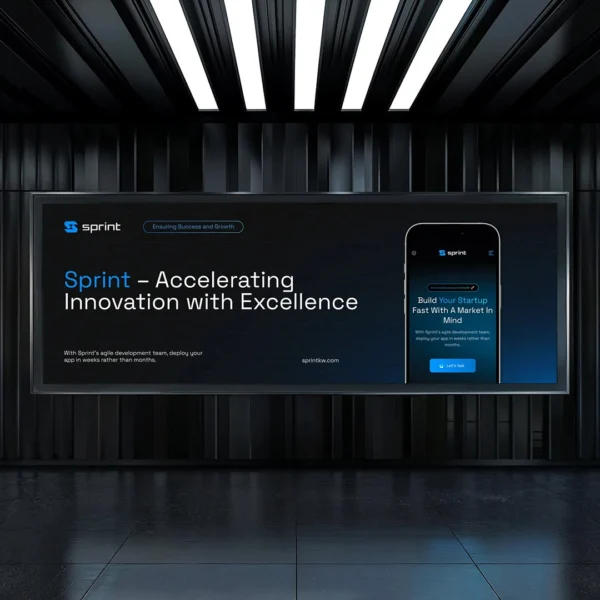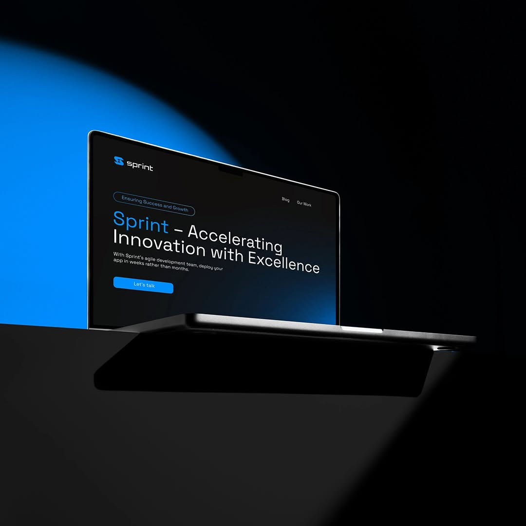 The Sprint Tech identity uses electric blue contrasts, angular typography, and dark backdrops to communicate speed, precision, and a high-tech feel. Mockups present signage, digital interfaces, stationery, packaging, and apparel with dramatic lighting and clean structure.