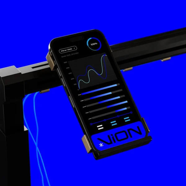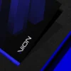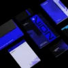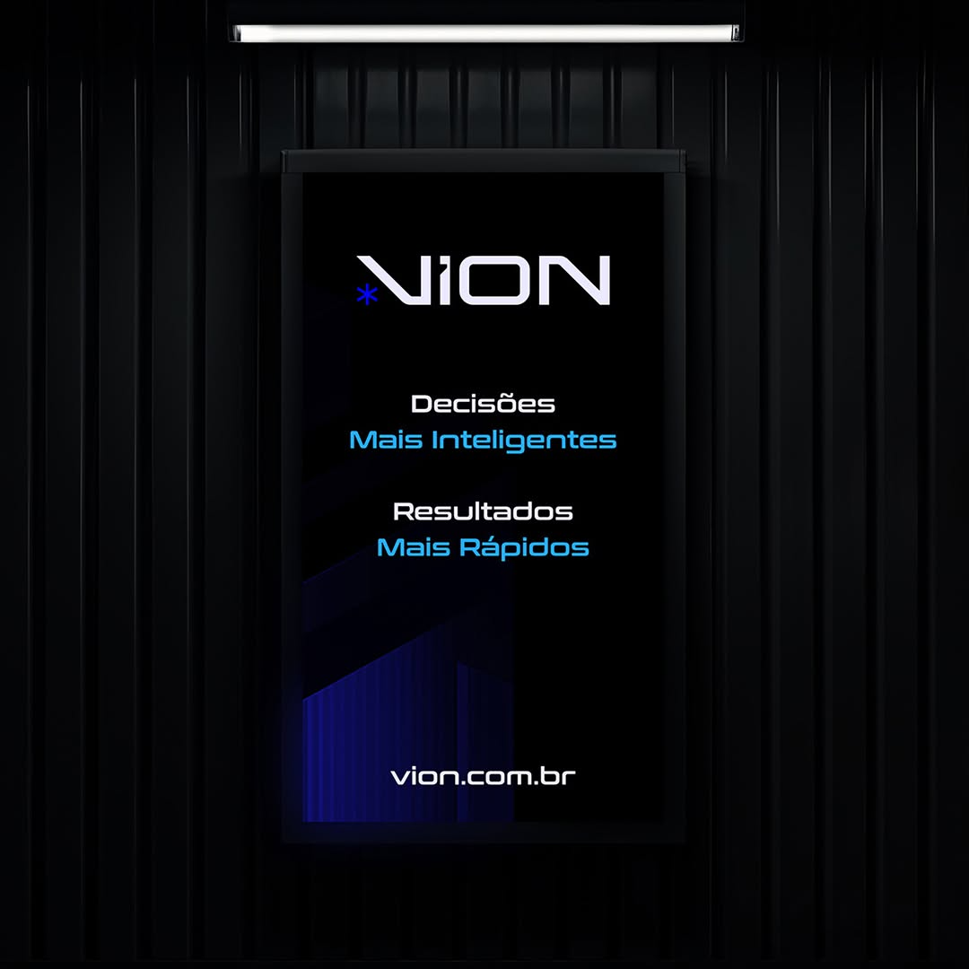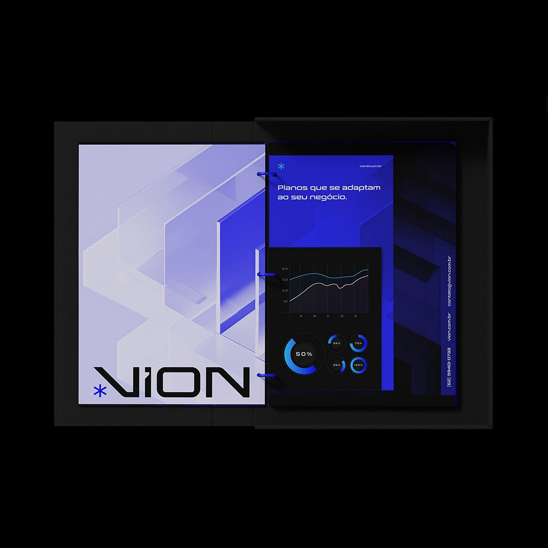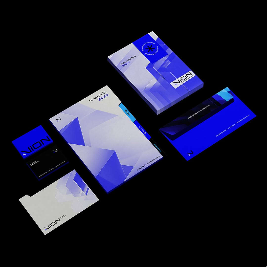 The Vion identity incorporates deep blues, angular typography, and digital gradients that emphasize intelligence and analytical sophistication. Mockups span mobile UI, presentation kits, stationery, and illuminated signage presented in high-contrast environments.